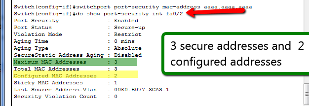 Along with configure these mac address , a port can be configure with a maximum number of allowed mac address (the default is one) We set them in one